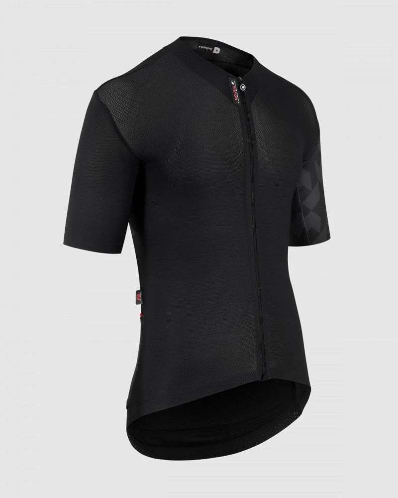 The jersey combines a body of miniCheck Tex—responsible for the signature ASSOS jersey texture—with a Stabilizer insert to anchor the pockets. The blend resists odor while promoting breathability and cooling airflow. Sleeves and pockets of Push Pull warp knit add a breathable, bi-stretch fit that wraps in stabilizing stretch. The textiles provide UPF 25, 30, and 50+ for the front, back, and sleeves, respectively. - CONSTRUCTION/FIT: