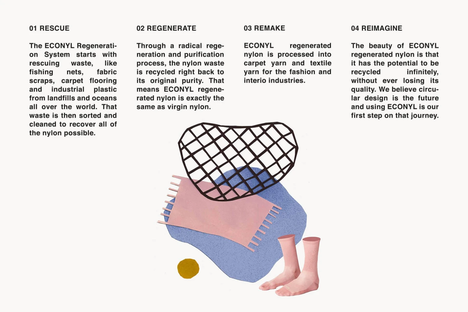 ECONYL® regenerated nylon is made out of waste that’s been rescued from landfills and oceans around the world. It performs exactly the same as brand new nylon and it can be recycled, recreated and remoulded again and again.