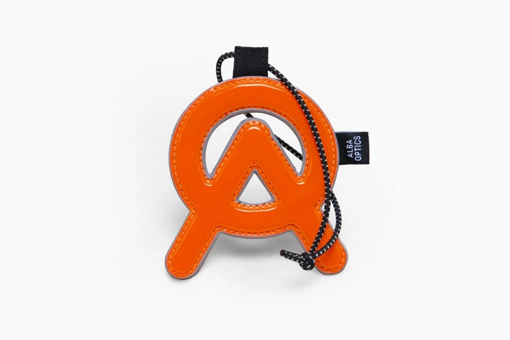 Ride safe with our LOGO REFLECTOR. Ideal for making visible during your adventures. The elastic black leash is easy to close around rings or cords of your bags. The front side is orange bumped reflective and the back silver.